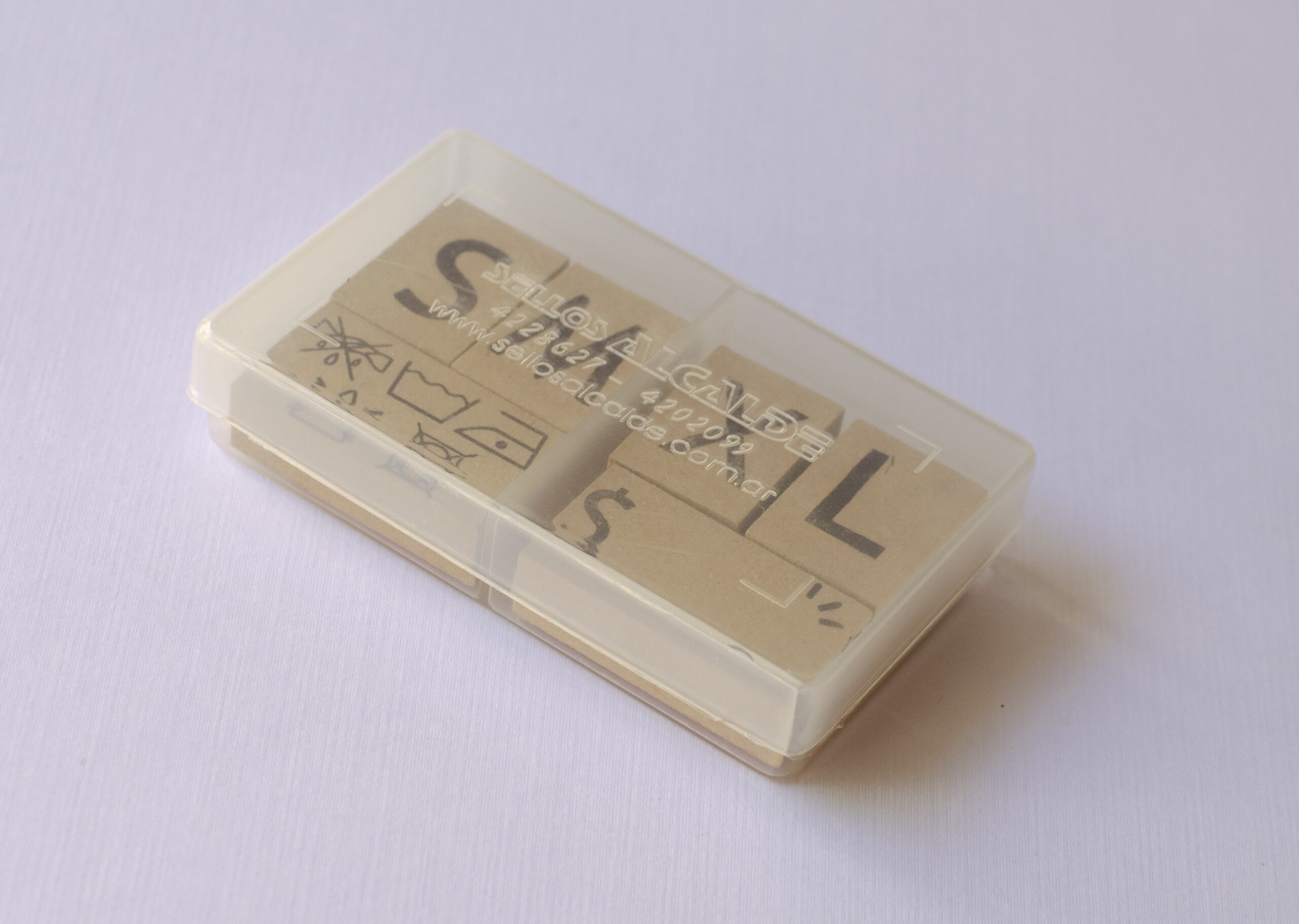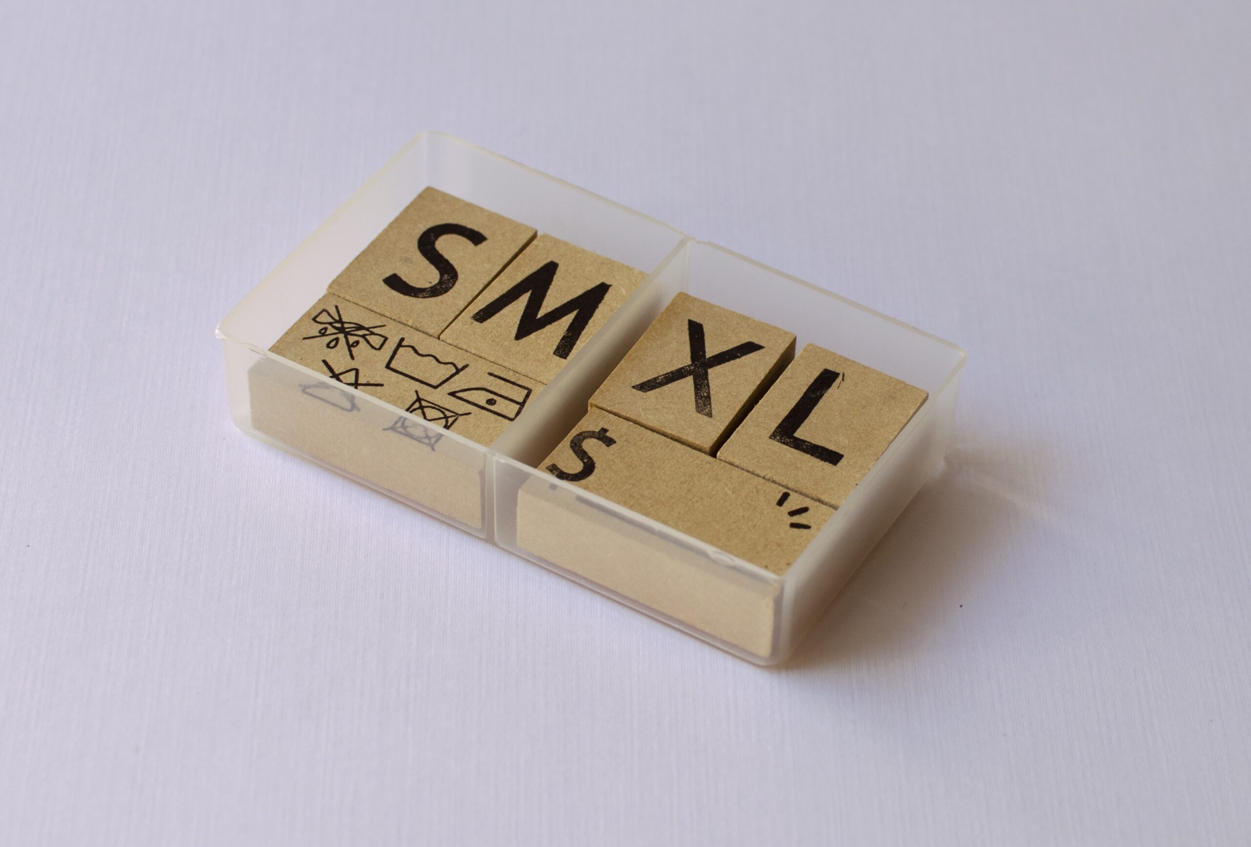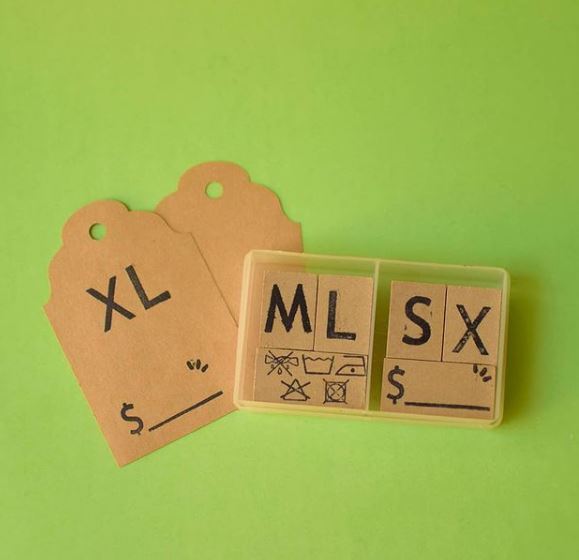 El kit incluye 4 sellos de 3x2cm. con las letras S, M, X y L; 2 sellos de 4x2cm. para indicar cuidado y colocar precio, caja contenedora plástica.